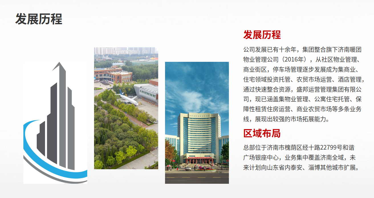 山东盛邦运营管理集团有限公司(简称“盛邦运营”)是一家注册于山东省济南市的综合性运营管理服务企业,以“专业化、规范化、人性化”为服务标准,定位为多业态综合服务提供商。
